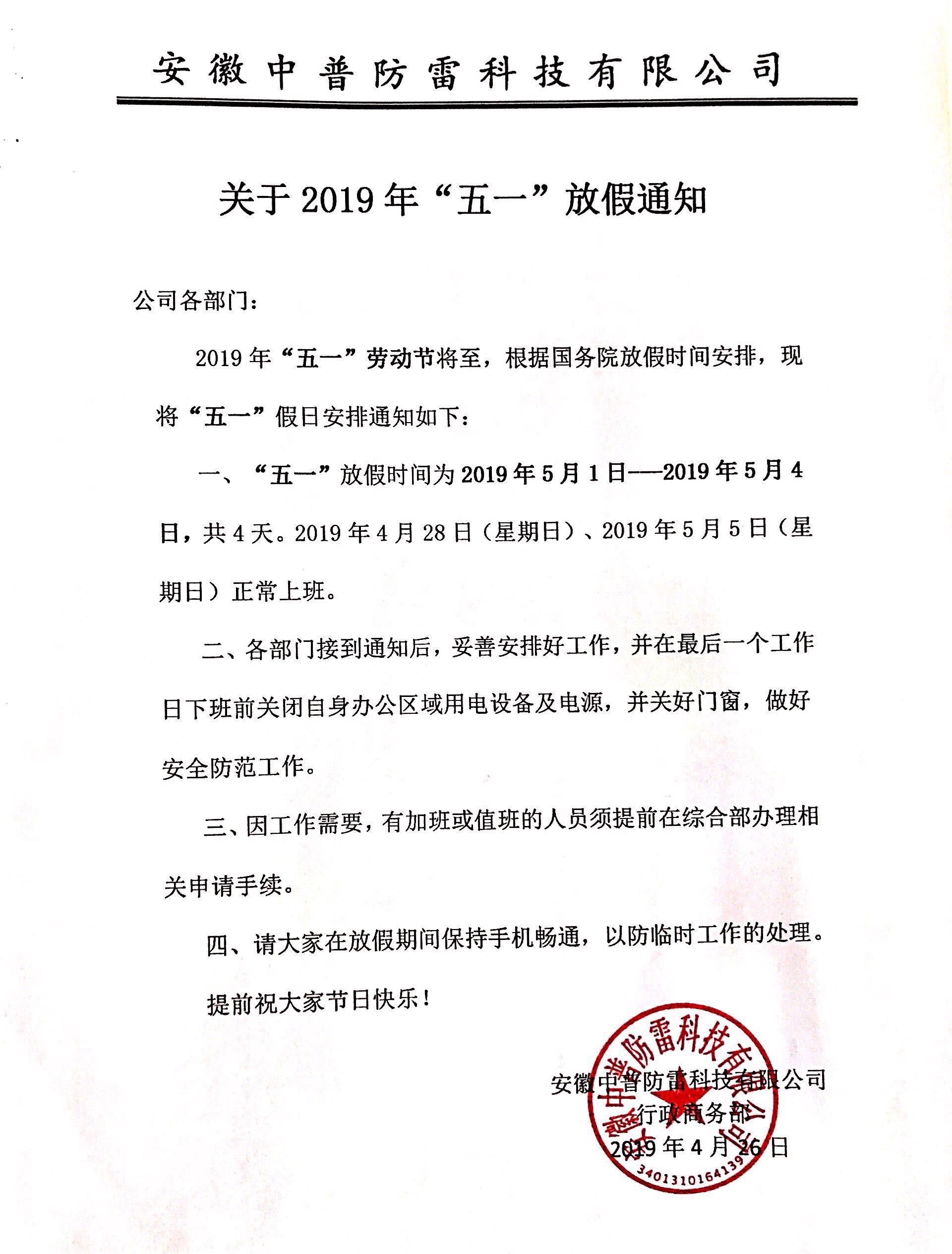 安徽中普防雷“關(guān)于2019年五一勞動(dòng)節(jié)放假通知”