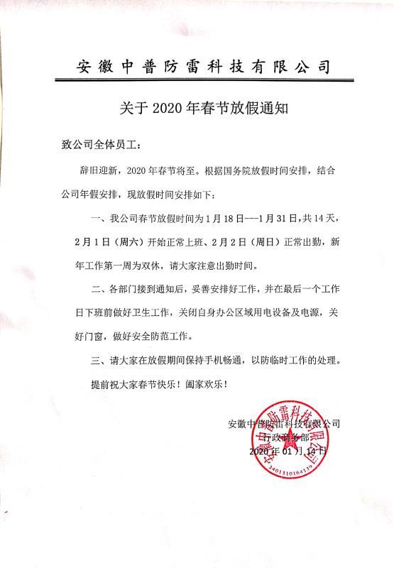 安徽中普防雷“關(guān)于2020年春節(jié)放假通知”