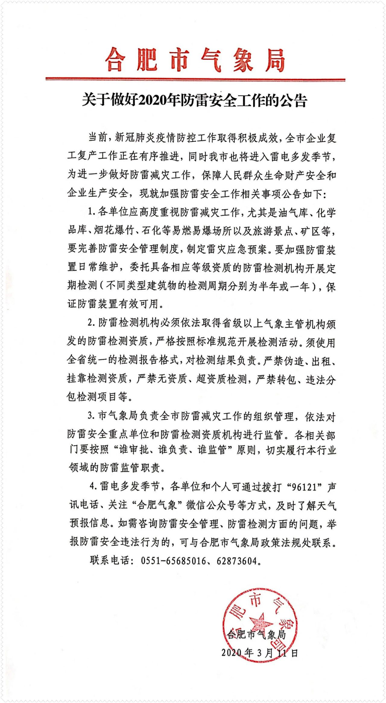 通告要求:負有防雷安全監(jiān)管職責的相關(guān)部門履行責任,做好雷電防護監(jiān)測預報預警、雷電災害調(diào)查鑒定、公益性單位(場所)防雷安全檢測和防雷科普宣傳等工作。同時,要求業(yè)主單位定期委托具備相應資質(zhì)等級的雷電防護裝置檢測機構(gòu),進行雷電防護裝置安全性能檢測。